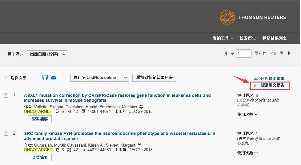 2、精炼后点击右上角“创建引文报告”(若超过1万篇则无法创建,相对繁琐,可以考虑多次拆分检索记录到1万条记录以下来计算,如Sci Rep,RSC ADV,PLOS ONE)