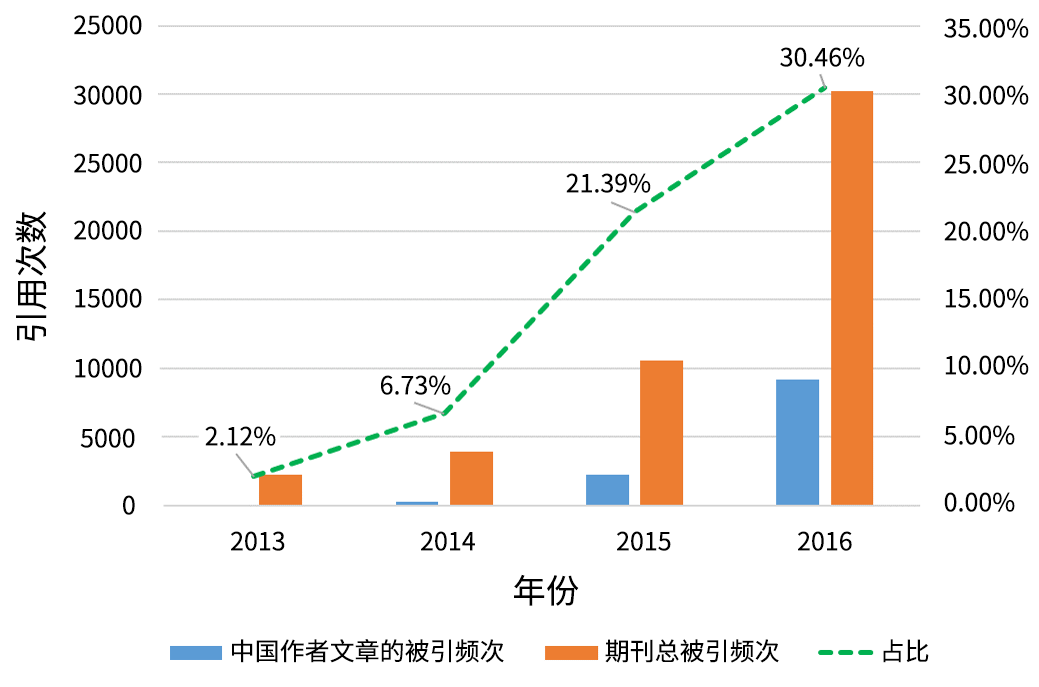 中国作者发表在Oncotarget的文章量俨然已占据了半壁江山,也难怪国内许多学者对该刊非常反感,与当年PLoS One的遭遇十分类似,目前已被一些机构“拉黑”。有评论指出该期刊编辑对选择审稿人不负责任,审稿和决策过程较随意,导致文章“来者不拒”;但也有不少作者遇到严格的同行评议过程致使被拒稿的情况。投稿过程的不确定因素太多,单凭一些个例就下定论似乎也并不合理。至于中国作者是否大量灌水的问题,确实很难说清,至少我们没有充足的理由去判断这些已发表论文的水平究竟如何,在此我仅针对近4年中国作者发表文章的被引频次作了初步的统计。如图所示,尽管中国作者发文量居高不下,但相对应的被引用数量占比也随之成比例地显著增加,2016年就占据了期刊总引用量的30.46%。这或许也证明了国人发表的文章水平尚可,一般能获得比较合理的被引用水平,似乎也没有大量发表了无人引用的“灌水”文章。