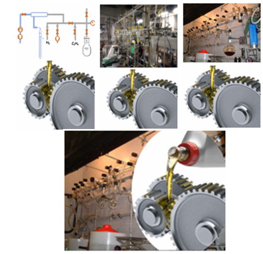 然后LetPub的设计师们根据作者的需求进行筹划设计方案。考虑到作者提供的照片比较杂乱,设计师给提供的照片添加了一个鱼眼扭曲效果,突出了相对整洁一些的部分,弱化了其他杂乱的部分。而主要研究重点是润滑油,所以整个设计采用黑白灰,只有润滑油部分使用黄色。一方面可以弱化背景,另一方面可以强调润滑油是整个研究中的重点,同时建议作者去掉背景,这样整个画面可能更加整洁,重点更突出。同时设计师们查看了作者的文章,并查看了作者提供的示意图,了解到作者的文章中主要又有乙烯和氮气参与到整个过程,所以将这两个元素以球棍模型的形式添加到了设计中,并且按照期刊以往的设计风格,有参照作者原有的想法(背景板用一些简单的管道表示),设计了一个以蓝黑的为主题背景颜色的版本。具体效果如下: