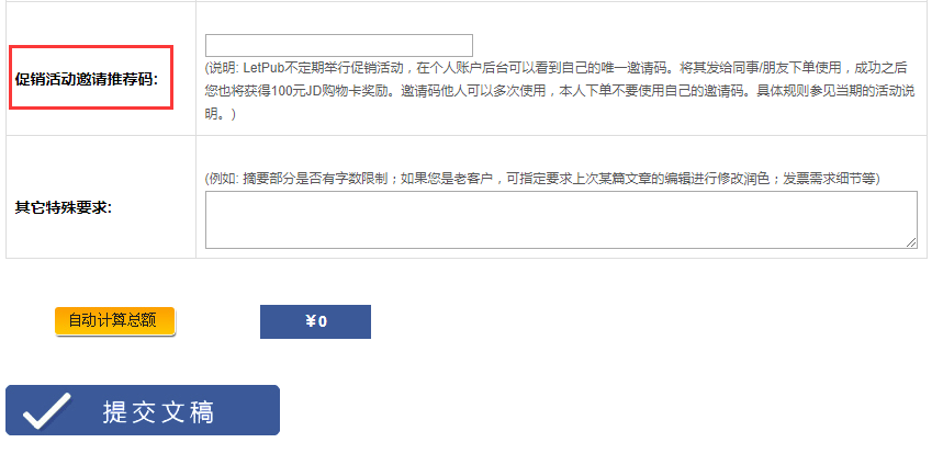 每个LetPub注册用户都有自己唯一的推荐码可供同事/朋友使用(请登录管理后台查看)。只要被推荐人在线提交订单时使用该推荐码并完成付款,推荐人就可以获赠一张100元京东购物卡。你推荐的客户及提交的订单越多,你的奖励也会越丰厚,不会封顶。